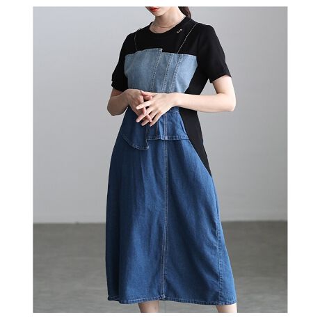 【ワンピース】 デニム 異素材 カットソー 配色 アシンメトリー スリット 半袖 ミモレ ブルー 青