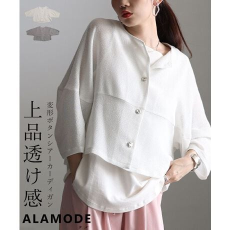 変形ボタンがさりげないアクセントになるカーディガン。さらっと軽く羽織れるので、春夏のコーデに重宝します。シンプルながらひと味違う、大人の着こなしにぴったりの一着です☆