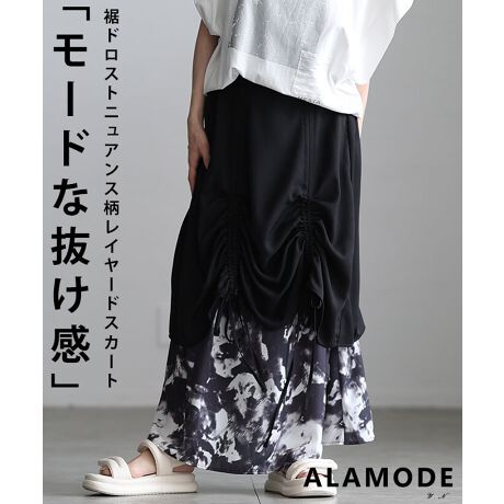 【スカート】 異素材 ドロスト プリント マーブル ロング ギャザー レイヤード ブラック 黒
