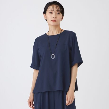 キレイ見えと機能性を兼ね備えた「キマル!」シリーズのプルオーバーブラウス。カジュアル寄りでもきちんと感が出るよう設計しました。袖口のターンが自然なアクセントになり、着こなしに奥行きをプラス。すっきりとした襟元で清潔感があり、肘にかかる袖丈が幅広いシーンに対応します。パンツと合わせた時のバランスも良く、一枚でスタイリングが完成します。同素材のパンツ(U5R12756、U7R12756)とセットアップで着用可能です。