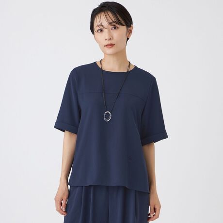 キレイ見えと機能性を兼ね備えた「キマル!」シリーズのプルオーバーブラウス。カジュアル寄りでもきちんと感が出るよう設計しました。袖口のターンが自然なアクセントになり、着こなしに奥行きをプラス。すっきりとした襟元で清潔感があり、肘にかかる袖丈が幅広いシーンに対応します。パンツと合わせた時のバランスも良く、一枚でスタイリングが完成します。同素材のパンツ(U5R12756、U7R12756)とセットアップで着用可能です。
