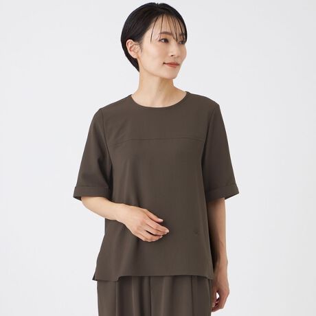 キレイ見えと機能性を兼ね備えた「キマル!」シリーズのプルオーバーブラウス。カジュアル寄りでもきちんと感が出るよう設計しました。袖口のターンが自然なアクセントになり、着こなしに奥行きをプラス。すっきりとした襟元で清潔感があり、肘にかかる袖丈が幅広いシーンに対応します。パンツと合わせた時のバランスも良く、一枚でスタイリングが完成します。同素材のパンツ(U5R12756、U7R12756)とセットアップで着用可能です。