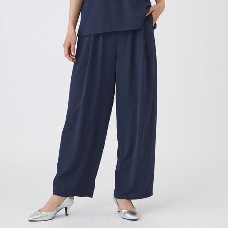 カーブパンツのシルエットをベースに、ギャザーパンツへ落とし込んだ一本。ウエストからヒップにかけて膨らまないよう設計しています。裾幅も広くなりすぎないよう調整し、素材の落ち感と相性の良いすっきりしたラインに仕上げました。楽な穿き心地ときれい見えを両立したデザインです。同素材のブラウス(U5M08756、U7M08756)、シャツ(U5M13756、U7M13756)とセットアップで着用可能です。