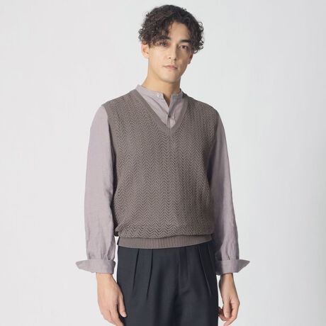 アイレット編み(はとの目のように小孔状穴の開いたきれいな透かし目の編地)のペーパーヤーンVネックベストです。