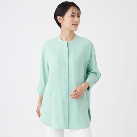 薄くて軽く、しなやかな落ち感が特徴のブラウス。バンドカラーが洗練された印象を与えます。長めの着丈で、さりげなく体型をカバーできるのもポイント。前を開けて羽織としても使えるため、季節の変わり目や外出時に一枚あると重宝します。同素材のパンツ(U5R12756、U7R12756)とセットアップで着用可能です。