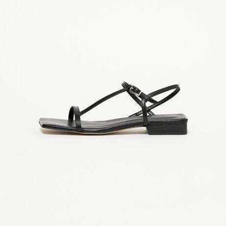 広めのスクエアトゥや直線的なストラップがモードさを漂わせます。