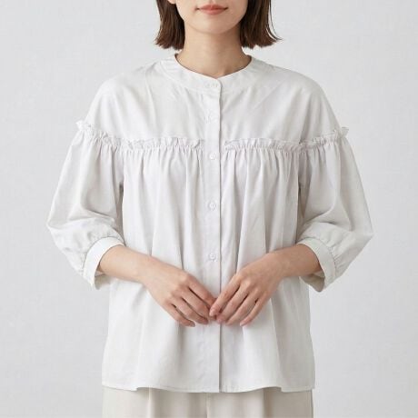 -胸元のフリルが顔周りを華やかに。甘さ控えめのバンドカラーで、大人の女性でも着やすいフェミニンブラウス。