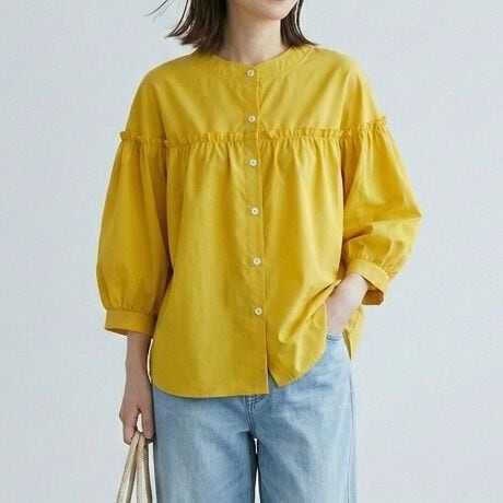 -胸元のフリルが顔周りを華やかに。甘さ控えめのバンドカラーで、大人の女性でも着やすいフェミニンブラウス。