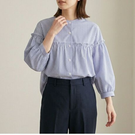 -胸元のフリルが顔周りを華やかに。甘さ控えめのバンドカラーで、大人の女性でも着やすいフェミニンブラウス。