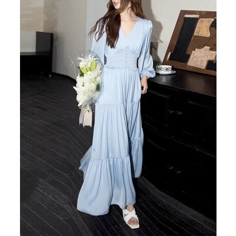 Vネックとティアードデザインが魅力の、上品なロングワンピース。