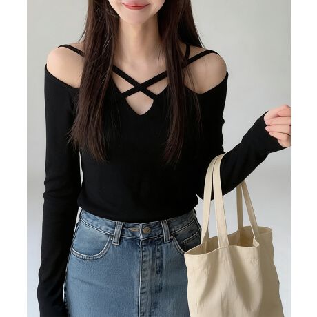 クロスストラップが目を引く、オフショルダーデザインの長袖Tシャツ。
