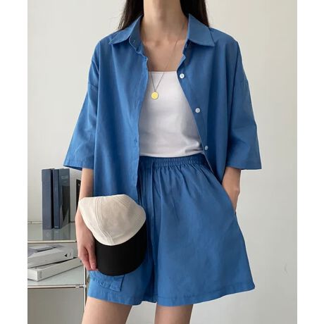半袖シャツとショートパンツのカジュアルセットアップ。