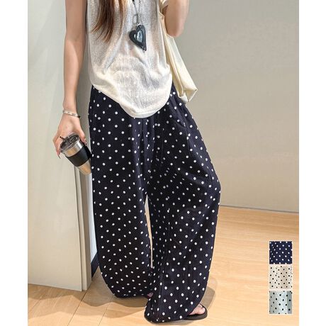 ドット柄が目を引く、ウエストゴム仕様で楽に穿けるワイドパンツ。