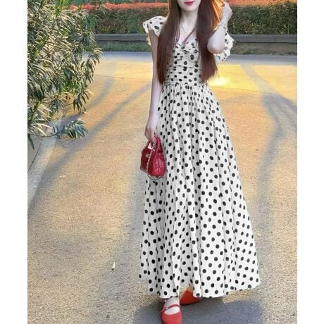 ドット柄フリルスリーブマキシ丈ワンピース