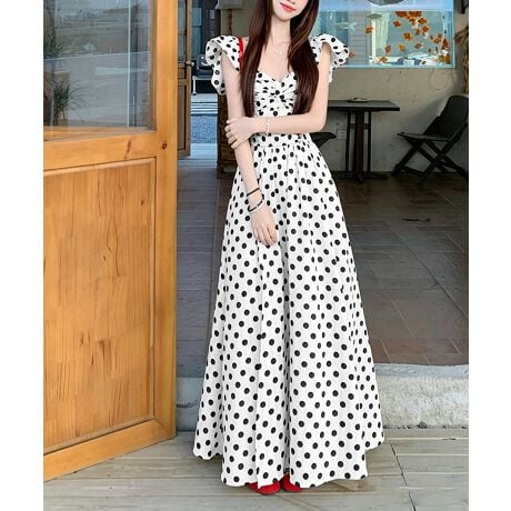 ドット柄が目を引く、フリルスリーブデザインのレディースロングワンピース。