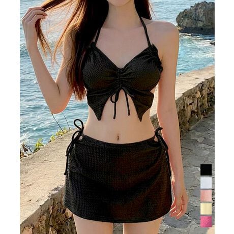 ビキニブラ×ショーツ×スカートを組み合わせた、フェミニンな雰囲気漂う水着3点セット。