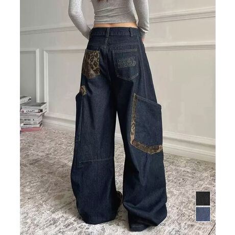 カーブシルエットを取り入れた、レオパード柄ポケットがアクセントのロングデニムパンツ。