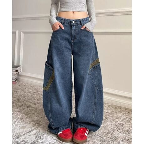 カーブシルエットを取り入れた、レオパード柄ポケットがアクセントのロングデニムパンツ。