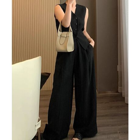 リネン混素材を使用したノースリーブベストとワイドパンツの上下2点セット。