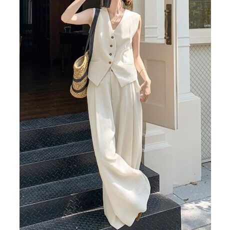 リネン混素材を使用したノースリーブベストとワイドパンツの上下2点セット。