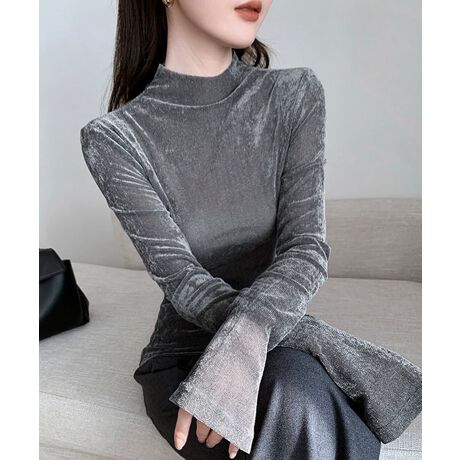 なめらかな質感と上品な光沢が魅力のベロアプチハイネックトップス。