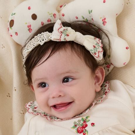 野イチゴ刺しゅうのリボンが可愛らしさを演出するヘアバンドです。