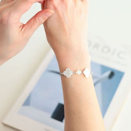 優しい輝きを手首に灯す、天然シェルクローバーブレスレット。アクセサリー初心者さんでも挑戦しやすい華著感&シンプルなデザイン。手首にアクセントがあることで細いパーツを際立たせ細見せ効果も期待できます。上品なデザインなので日常〜オフィスまで多様なシーンでご着用いただけます◎腕を通してスーッとアジャスター部分をスライドさせるだけで簡単に着脱可能◎フリーサイズなのでご自身の手首に合わせて窮屈感なくご着用していただけます。