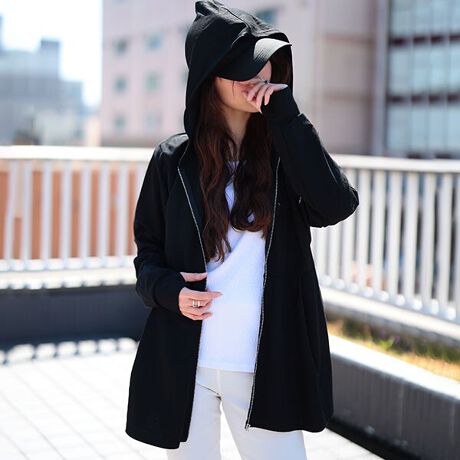 ベーシックなジップアップパーカーに、ペプラムフレアのシルエットを落とし込んだ、シンプルながらも女性らしさ漂う一着。UVカット・接触冷感・吸水速乾機能の多機能だから、汗ばむ季節にぴったり、頼れるアイテム。さっと羽織ってお洒落に紫外線対策できちゃいます♪すっぽり被れるフード付きで顔周りも紫外線対策可能。ペプラムシルエットで腰回りやヒップをふんわり包み込み、袖口にフィンガーホール付きだから、手元までしっかりカバー。ジップアップだから、さっと羽織るだけでサマ見えに。体型カバーも抜かりない頼れるアイテム。