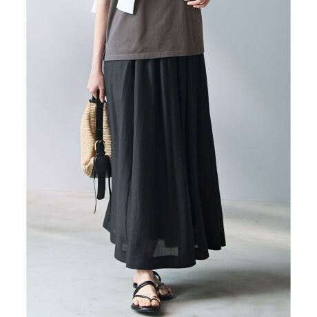 動くたびふわりと揺れる、エアリーでニュアンスたっぷりな雰囲気が魅力のフレアスカートです。腰回りはスッキリとさせつつ、裾に向かってふんわりと広がる美しいフレアシルエットに仕上げました。ウエストはゴムギャザー仕様で、イージーで快適な穿き心地を叶えます。また、ウエストベルト部分は、ひと折りしても裏地が覗かない工夫を施しており、少し短く穿きたい時には長さを調整できるのも嬉しいポイントです。やや長めのTシャツや、フォルム感のあるカットソーをラフに合わせた、トレンドライクな着こなしがおすすめ。ご家庭でお手入れが可能で、デイリーに気兼ねなく着回していただけるアイテムです。カラーは、クリーンな印象のオフホワイト(#001)、柔らかな雰囲気のモカ(#030)、ベーシックで合わせやすいブラック(#005)の3色展開です。