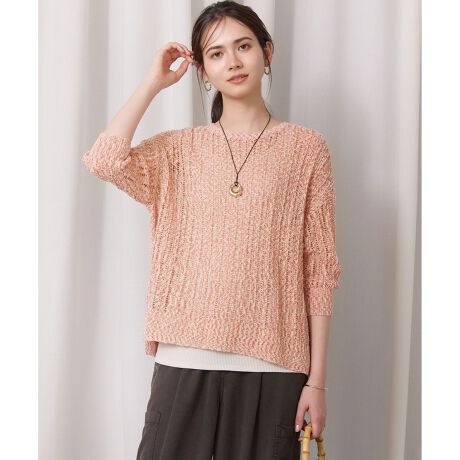 縦にストライプ状の透かしの柄編み地が特徴のプルオーバーニットです。ゆとりのあるシルエットで、ざっくりとしたサマーニットらしいドライな肌触りをお楽しみいただけます。少し横に広めに開いた襟ぐりが、さりげない女性らしさをプラス。表情感のあるカラーミックスのスラブ糸を使用しており、コーディネートのアクセントになるアイテムです。ボトムにはデニムやエアリーフレアスカート はもちろん、ノースリーブワンピースの上にレイヤードしていただくのもおすすめです。カラーは、明るく柔和な印象のコーラルレッド(#010)、爽やかで涼しげな印象のサックス(#072)、肌馴染みが良く合わせやすいタンジェリン(#020)の3色展開です。
