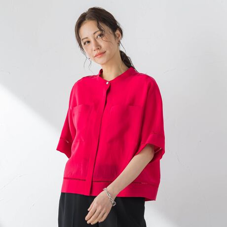 シアー感がある素材ですが、ポケット付きのデザインで透けすぎず、上品に着こなせる一枚です。
