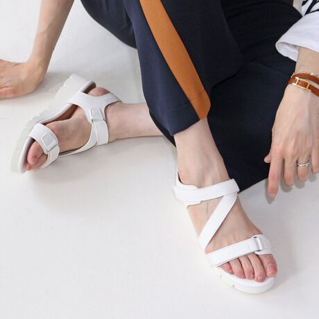 アシンメトリーなベルト使いが足元に程よいスパイスをプラスするFin(フィン)の厚底アシンメトリーベルトサンダルが登場しました。程よくシェイプされたフォルム×斬新なベルトデザインが大人カジュアルな足元を完成させます。しっとりと高級感のある素材を使用することによってラフすぎない大人の女性にピッタリな一足に仕上げました。