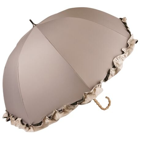 晴雨兼用で使えるフリル付きショート傘です。裾のフリルが女性らしいデザインです。持ち手は竹製で上品な仕上がりです。 傘生地に特殊なコーティング加工を施しているため、より優れた 紫外線防止効果が得られます。 また、降雨時のご使用においても防水性に優れているので雨の日、晴れの日兼用でご利用頂けます。
