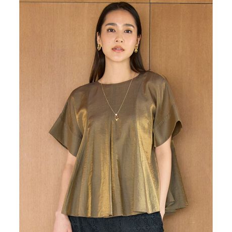 メタリックな光沢とフレアシルエットがコーディネートを華やかにするブラウス■デザインバストの下からたっぷりと広がるフレアシルエットが美しいペプラムブラウスです。ウエストよりも少し高めの位置からフレアを出すことで、お腹や腰周りを自然にカバーしつつ、華やかさもあります。フレアが生み出す陰影が、素材の持つ奥行きのあるカラーを際立たせ、上品で華やかな印象を演出します。メタリックな光沢感がありながらも程よいシアー素材のため、見た目にも涼やかで抜け感があり、重くなりすぎません。シンプルなボトムと合わせるだけで、洗練された大人のコーディネートが完成します。■素材ナイロンと綿糸の光沢の違いが生み出す、メタリックな輝きが印象的なツイル素材です。ナイロンと綿糸の色に差をつけることで、奥行きのあるシャンブレーの色合いを表現しています。しなやかで薄く軽い質感に加え、綿のナチュラルで肌離れの良いタッチが特徴で、暑くなる時期に向けて快適に着ていただけます。無地でありながらもファッション性が高く、ご自宅で手洗い可能なウォッシャブル仕様なのも嬉しいポイントです。