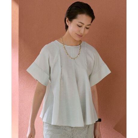 メタリックな光沢とフレアシルエットがコーディネートを華やかにするブラウス■デザインバストの下からたっぷりと広がるフレアシルエットが美しいペプラムブラウスです。ウエストよりも少し高めの位置からフレアを出すことで、お腹や腰周りを自然にカバーしつつ、華やかさもあります。フレアが生み出す陰影が、素材の持つ奥行きのあるカラーを際立たせ、上品で華やかな印象を演出します。メタリックな光沢感がありながらも程よいシアー素材のため、見た目にも涼やかで抜け感があり、重くなりすぎません。シンプルなボトムと合わせるだけで、洗練された大人のコーディネートが完成します。■素材ナイロンと綿糸の光沢の違いが生み出す、メタリックな輝きが印象的なツイル素材です。ナイロンと綿糸の色に差をつけることで、奥行きのあるシャンブレーの色合いを表現しています。しなやかで薄く軽い質感に加え、綿のナチュラルで肌離れの良いタッチが特徴で、暑くなる時期に向けて快適に着ていただけます。無地でありながらもファッション性が高く、ご自宅で手洗い可能なウォッシャブル仕様なのも嬉しいポイントです。