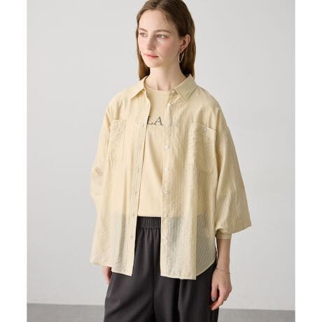 [型番:293268]軽やかに羽織れるシアーシャツダブルポケットがさりげないアクセントになったシアーシャツ。さらりとした素材感のストライプ柄で、年齢や体型を問わず取り入れやすいデザインに仕上げています。一枚で着るのはもちろん、前を開けて羽織りとして使うと抜け感のあるスタイリングに。インナーにロゴTやタンクトップを合わせて、軽やかなレイヤードも楽しめます。