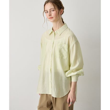 [型番:293268]軽やかに羽織れるシアーシャツダブルポケットがさりげないアクセントになったシアーシャツ。さらりとした素材感のストライプ柄で、年齢や体型を問わず取り入れやすいデザインに仕上げています。一枚で着るのはもちろん、前を開けて羽織りとして使うと抜け感のあるスタイリングに。インナーにロゴTやタンクトップを合わせて、軽やかなレイヤードも楽しめます。