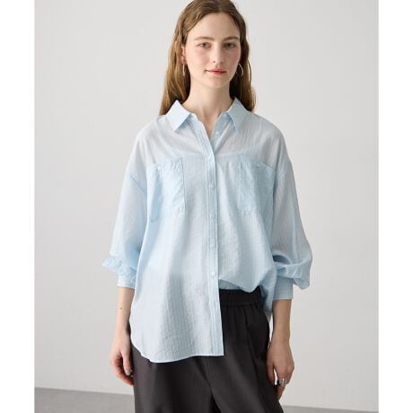 [型番:293268]軽やかに羽織れるシアーシャツダブルポケットがさりげないアクセントになったシアーシャツ。さらりとした素材感のストライプ柄で、年齢や体型を問わず取り入れやすいデザインに仕上げています。一枚で着るのはもちろん、前を開けて羽織りとして使うと抜け感のあるスタイリングに。インナーにロゴTやタンクトップを合わせて、軽やかなレイヤードも楽しめます。