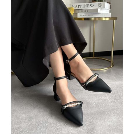 パールバー アンクルストラップ ポインテッドトゥ ローヒール パンプス
