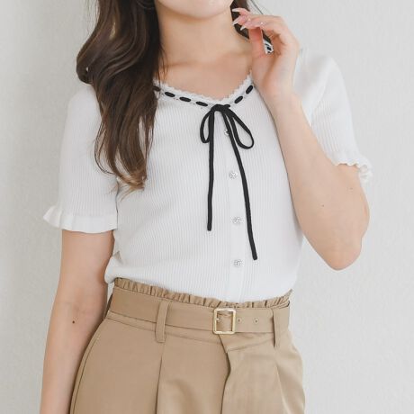 2026春夏新作 リボン付きレーストリムVネック半袖ニット
