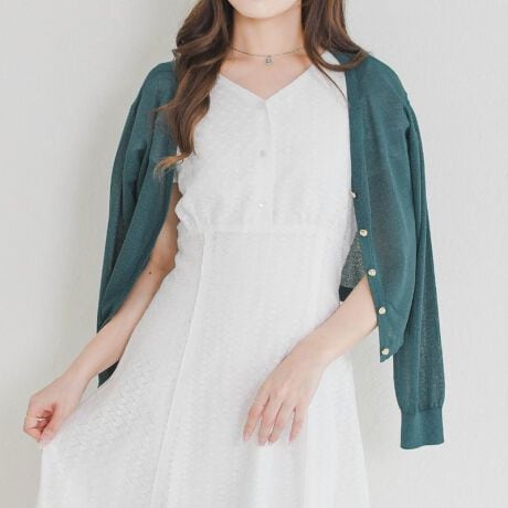 ベーシックなVネックにラメのきらめきと釦ディテールをプラスした、上品なカーディガンです。透け感のある柔らかなスパークラメ素材を使用し、さりげない光沢感で華やかな印象に。Vネックデザインが首元をすっきりと見せ、女性らしさを引き立てます。ニュアンス感のある金釦が、シンプルなシルエットの中にトレンド感と高級感をプラス。少し短めなクロップド丈でバランスが取りやすく、ワンピースやスカートとのスタイリングも好相性。ウエスト位置を高く見せ、スタイルアップ効果も期待できます。