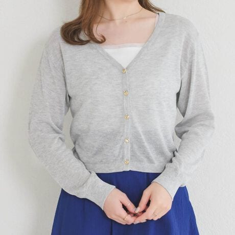 ベーシックなVネックにラメのきらめきと釦ディテールをプラスした、上品なカーディガンです。透け感のある柔らかなスパークラメ素材を使用し、さりげない光沢感で華やかな印象に。Vネックデザインが首元をすっきりと見せ、女性らしさを引き立てます。ニュアンス感のある金釦が、シンプルなシルエットの中にトレンド感と高級感をプラス。少し短めなクロップド丈でバランスが取りやすく、ワンピースやスカートとのスタイリングも好相性。ウエスト位置を高く見せ、スタイルアップ効果も期待できます。