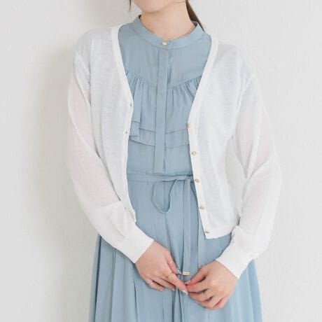 ベーシックなVネックにラメのきらめきと釦ディテールをプラスした、上品なカーディガンです。透け感のある柔らかなスパークラメ素材を使用し、さりげない光沢感で華やかな印象に。Vネックデザインが首元をすっきりと見せ、女性らしさを引き立てます。ニュアンス感のある金釦が、シンプルなシルエットの中にトレンド感と高級感をプラス。少し短めなクロップド丈でバランスが取りやすく、ワンピースやスカートとのスタイリングも好相性。ウエスト位置を高く見せ、スタイルアップ効果も期待できます。