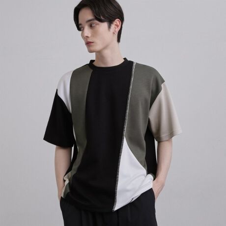 アシンメトリーなカッティングと配色が目を惹く、デザイン性の高い半袖プルオーバー。