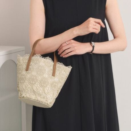 フラワーモチーフのレースを贅沢にあしらった、存在感のあるトートバッグ。