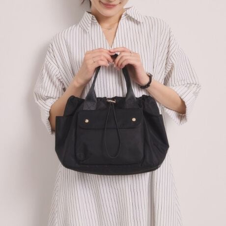 ナイロン100%の軽やかな素材感と、広めのマチがつくる立体的なフォルムが魅力です。