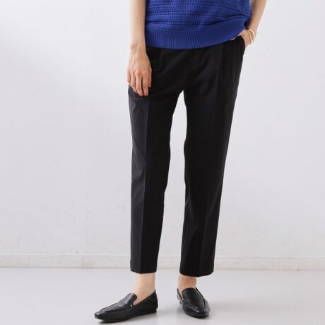 センタープレスを効かせた、すっきり見えのテーパードシルエット。