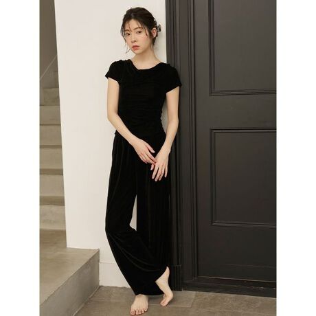 上品な光沢感としなやかな肌触りを楽しめる、シアー感のあるベロア素材のセットアップです。