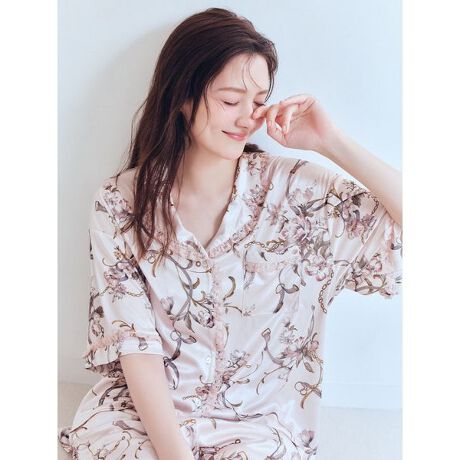 <b>旬のスカーフ柄プリントの艶めく開襟シャツ</b>