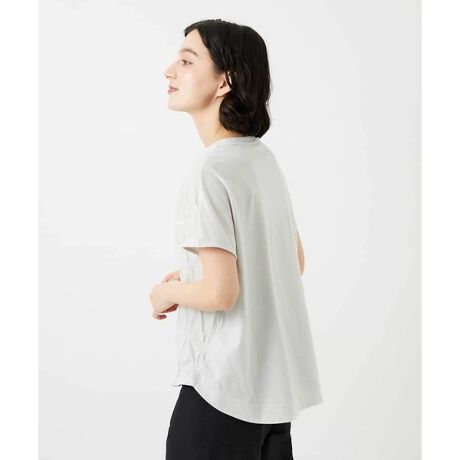 タック柄の凹凸感でアルファベット柄を表現しており、表情豊かな柄で、清涼感のあるさらっとした肌触りとストレッチ性を両立した素材で、ストレスフリーな着心地です。二の腕を美しく見せる絶妙なスリーブラインとショルダーのカッティングで、一枚着としても羽織りのインナーやベストとしても幅広く着合わせしていただけるアイテムです。後身頃はコットンの柔らかさと麻の清涼感で、肌当たりも優しいカットソー素材を使用しラウンドしたヘムラインも腰回りをすっきり見せてくれます。同素材の長袖カットソー【NHKGE46170】もございます。